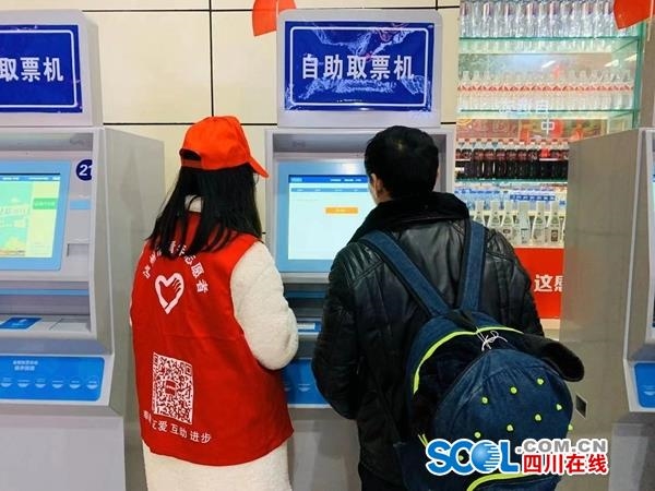 四川在线消息(张其 记者 魏冯 吴浩)“叔叔,取汽车票可以直接把身份证放在这个机器上就可以了”。1月22日,在泸州市西南商贸城客运站内,泸州市青年志愿者“小桂花”正在热心的指引乘客如何网上取汽车票。