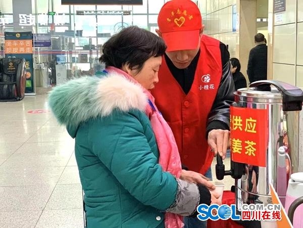 泸州市青年志愿者“小桂花”正在为旅客倒姜茶。张其摄