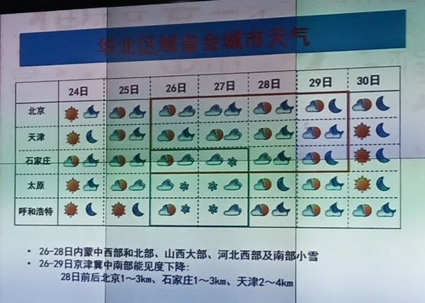 北京市气象台预计,华北地区26日-29日气象扩散条件较差,持续时间长,京津有轻度-中度霾,河北中南部及沿山有中度-重度霾。30日扩散条件有所好转。