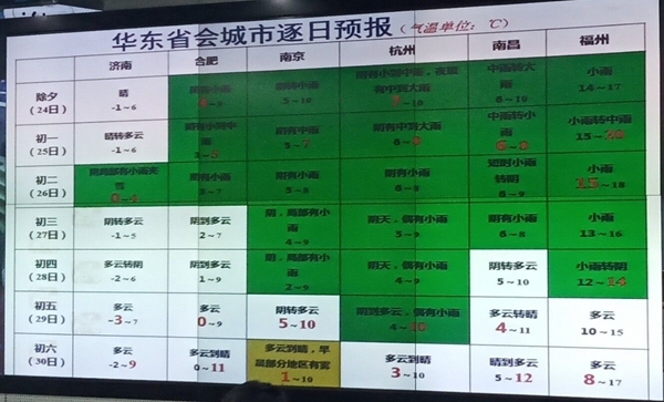 除夕到初三(24日到27日),上海多阴雨天气,对户外旅游景点有较大影响,城市高层景观视程较差。江西、浙江、福建的部分地区有大到暴雨。
