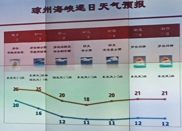 除夕到初一,广东中东部海面东北到东风6级阵风7级、北部湾东北风6-7级阵风8级;初二到初六,华南沿海海面东北风6级。