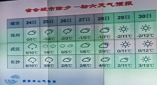 26日,华中区域气温降至最低点,最高气温:北部2~5℃,南部5~8℃。河南大部小到中雪,局部大雪;湖北北部和东部有弱的雨雪天气。