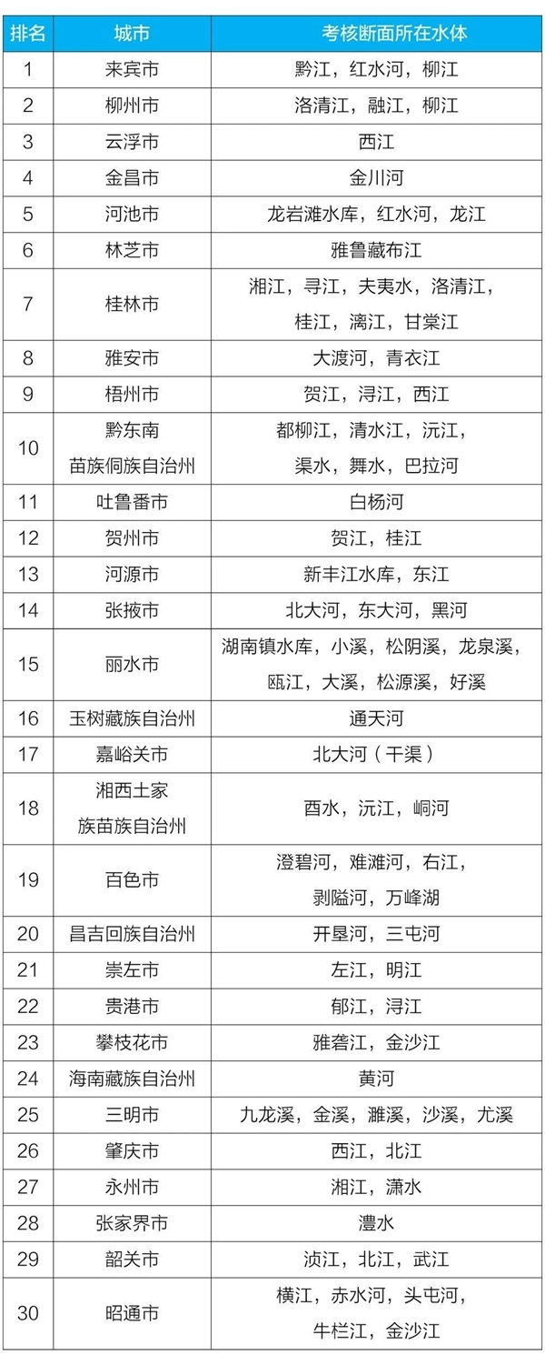 通报称,参加排名的全国地级及以上城市,覆盖2050个国控断面(其中1940个为国家地表水考核断面,110个为入海控制断面)。2019年1-12月,全国地级及以上城市中,来宾、柳州、云浮等30个城市国家地表水考核断面水环境质量相对较好(从第1名到第30名),吕梁、营口、沧州等30个城市国家地表水考核断面水环境质量相对较差(从倒数第1名到倒数第30名)。