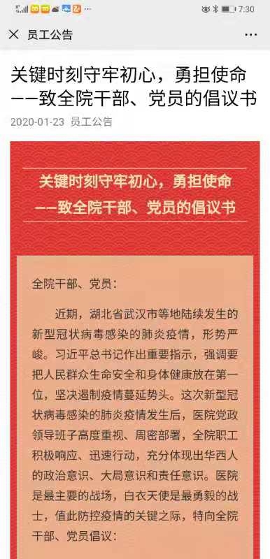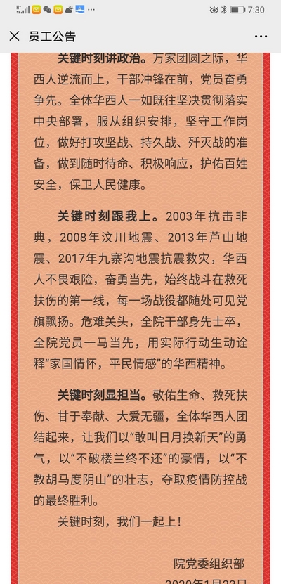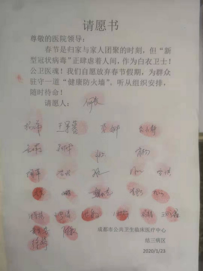四川在线消息(记者 李寰)成都市公共卫生临床医疗中心的医护人员们发出“请愿”:春节是归家与家人团聚的时刻,但新冠状病毒正肆虐人间,作为白衣卫士,公卫医魂!我们自愿放弃春节假期,为群众驻守一道“健康防火墙”。听从组织安排,随时待命。请愿人是该医院的25名医护人员。