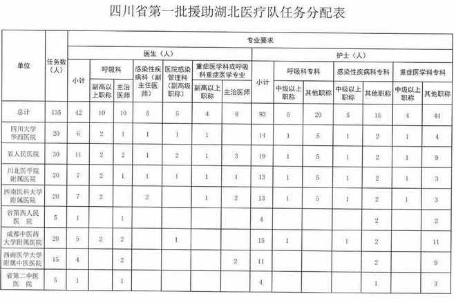 目前,四川省卫生健康委员会已发布“关于组派医疗团队援助湖北应对新型肺炎”的通知,决定将从四川大学华西医院、四川省人民医院、西南医科大学附属医院、川北医学院附属医院、四川省第四人民医院、成都中医药大学附属医院、西南医科大学附属中医院、四川省第二中医院抽调135名医护人员组建第一批救治医疗队,近日赶赴湖北援助新冠肺炎救治工作。