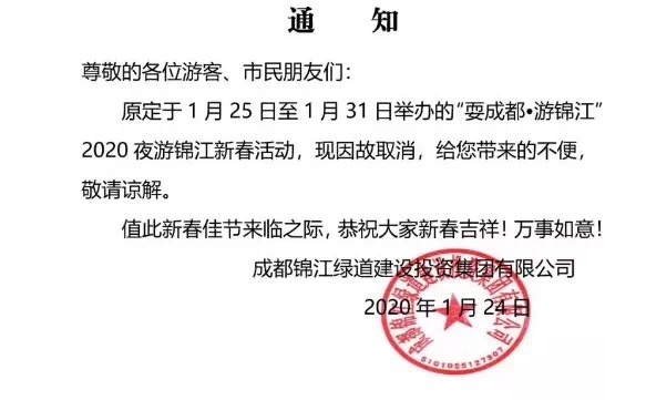 1月24日,成都锦江绿道建设投资集团有限公司发布公告,取消原定于1月25日至1月31日举办的“耍成都•游锦江”2020夜游锦江新春活动。