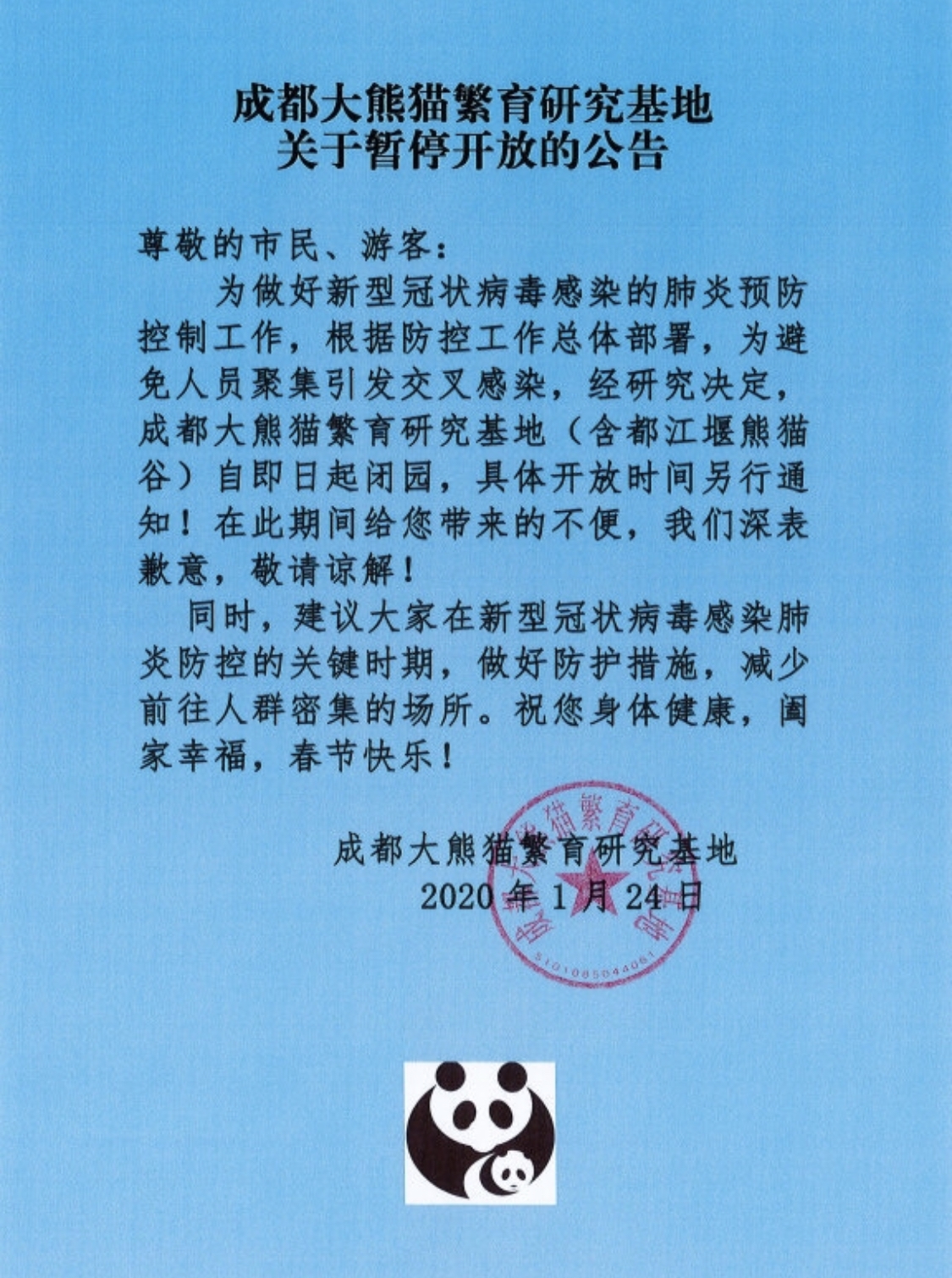 四川在线消息(记者 吴浩)1月24日,成都大熊猫繁育研究基地发布公告,即日起闭园,具体开放时间另行通知。