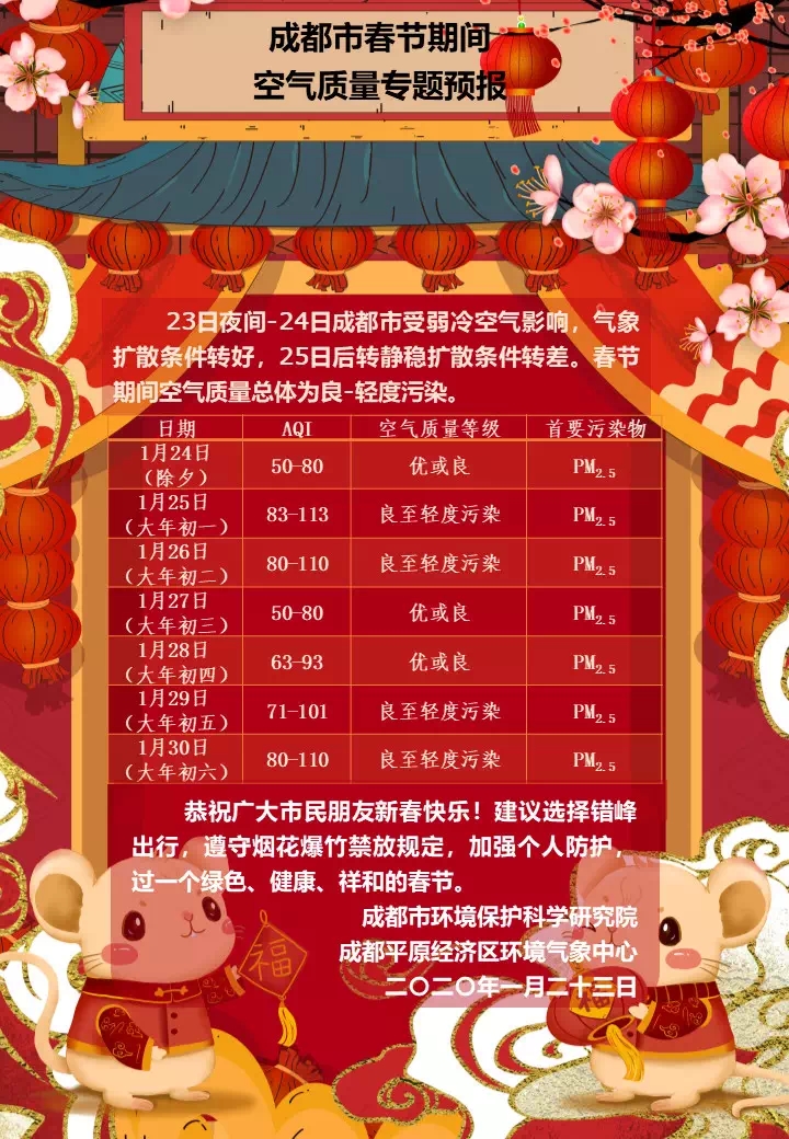 1月24日,记者从成都市生态环境局获悉,成都市春节期间空气质量专题预报发布,1月24日成都市受弱冷空气影响,气象扩散条件转好,25日后转静稳扩散条件转差。春节期间空气质量总体为良至轻度污染。