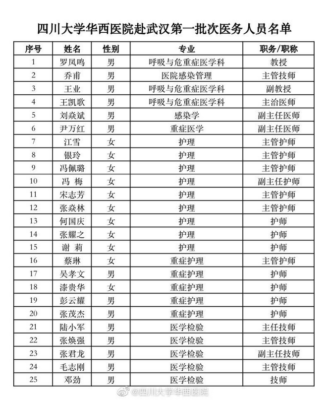 四川在线消息(记者 李寰)华西医院支援武汉第一批次队员已经集结完毕,25名医护人员分别来自呼吸与危重症医学科、医院感染管理、护理等科室,其中有5名医师,14名护士和6名技师,他们均具备过硬的专业技术能力。让人感动的是,根据卫健委的安排,华西医院需要派出20名医护人员赴汉,但大家积极踊跃地报名,最终超额完成任务。