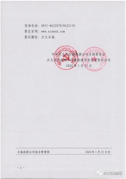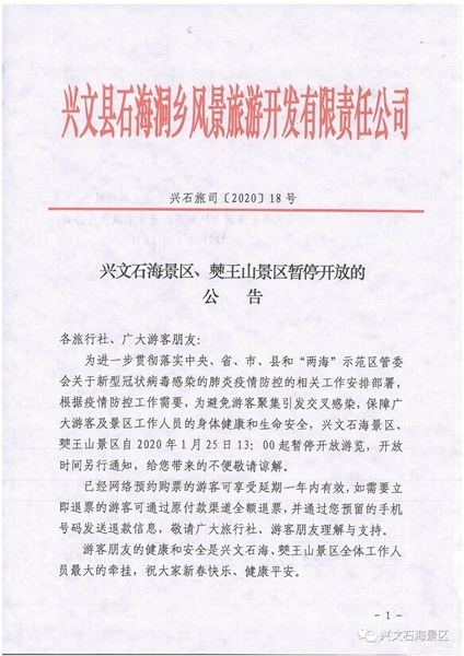 四川在线消息(记者 颜婧)1月25日,据宜宾市兴文县石海洞乡风景旅游开发有限责任公司消息,根据新型冠状病毒感染的肺炎疫情防控工作需要,为避免人员聚集引发交叉感染,保障广大游客及景区工作人员的身体健康和生命安全,兴文石海景区、僰王山景区自1月25日13:00起暂停开放游览,开放时间另行通知。