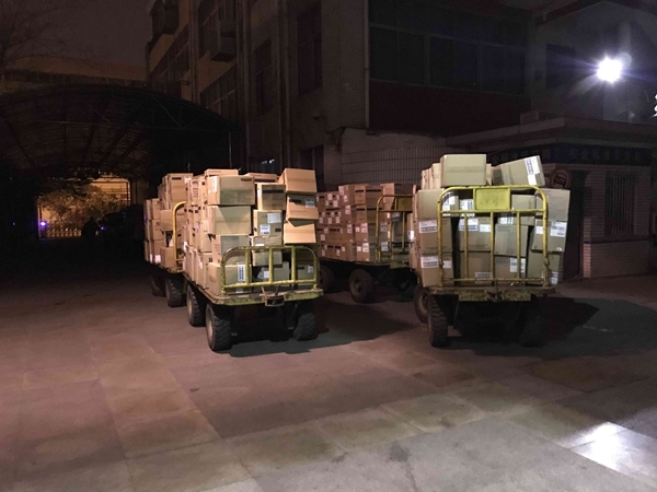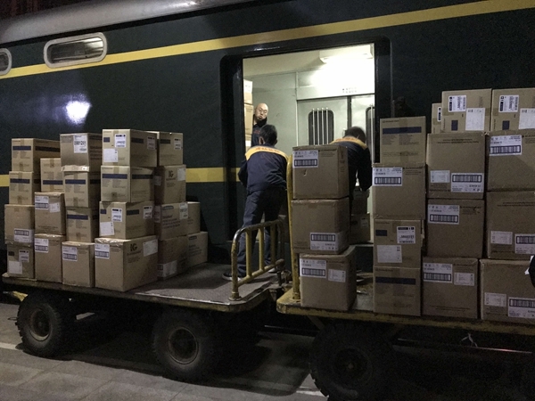 1月25日早上天还未亮,接车行李员秦永涛、行包调度严兵、行李值班员金延成以及行包装卸人员早已到达站台,等候迎接上海南至成都的K351到来。6时33分,列车到站,列车行李员将车门打开,在行李员秦永涛的指挥下,装卸人员立即组织上车对车厢内的防疫物资进行紧急卸车。行包调度严兵和行李值班员金延成在站台上也没有丝毫放松,多方位盯控站台装卸作业,确保防疫物资数量准确,包装完好,同时协助装卸人员提前摘挂拖车,保证整个装卸流程快而不慌。