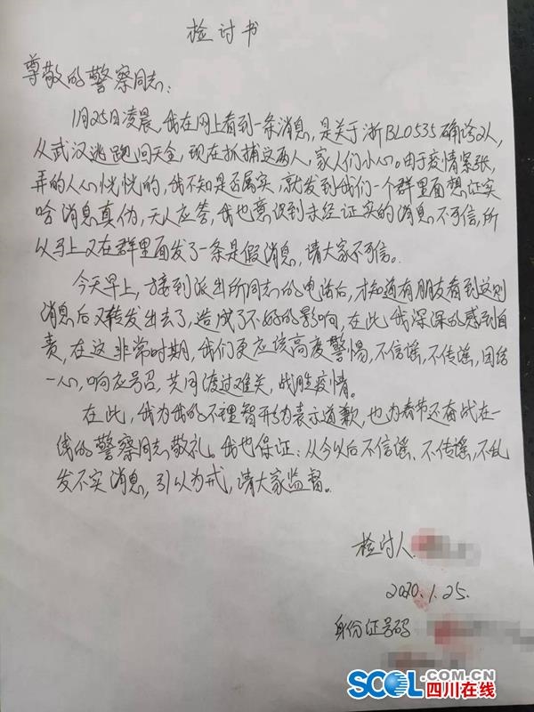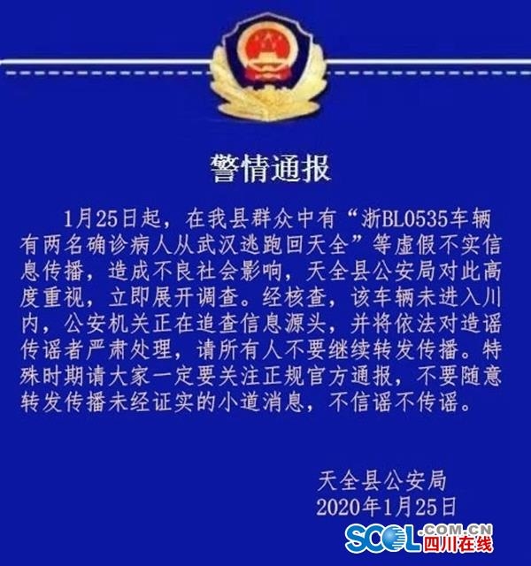 四川在线消息(记者 文莎)1月25日,雅安市天全县公安局城厢派出所接报称:有人在网上传播“浙BL0535车辆有两名确诊病人从武汉逃跑回天全”等不实信息。