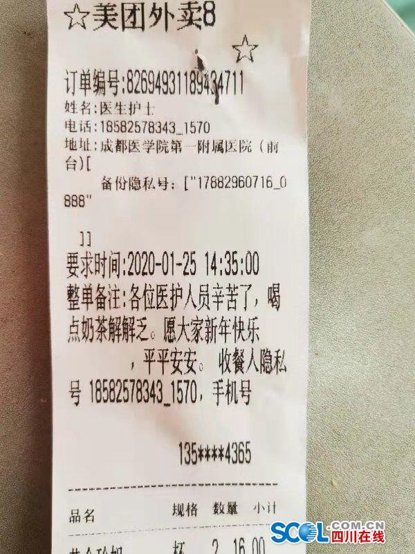 四川在线消息(何军 记者 石小宏)珍珠奶茶、燕麦奶茶、黑砖奶茶......各式各样口味奶茶,大年初一下午,一份12杯既暖胃又暖心的奶茶外卖,送到了成都医学院第一附属医院。外卖小票上,备注着:各位医护人员辛苦了,喝点奶茶解解乏,愿大家新年快乐,平平安安。