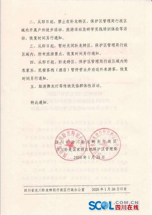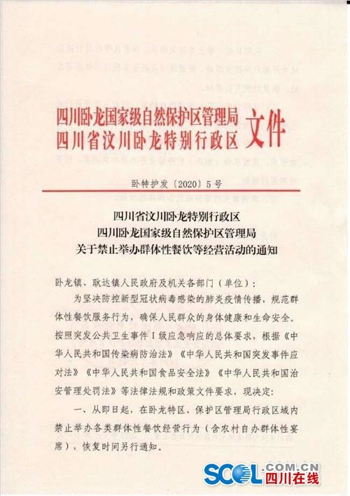 四川在线消息(记者寇敏芳)1月26日,记者从卧龙特别行政区办公室获悉,为防控新型冠状病毒感染的肺炎疫情传播,四川省汶川卧龙特别行政区、四川卧龙国家级自然保护区管理局发布公告。