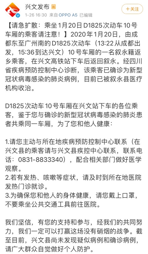官微呼吁当天在D1825次动车10号车厢在兴文站下车的乘客主动与当地疾控中心联系,采取相应后续观察措施,以确保安全。