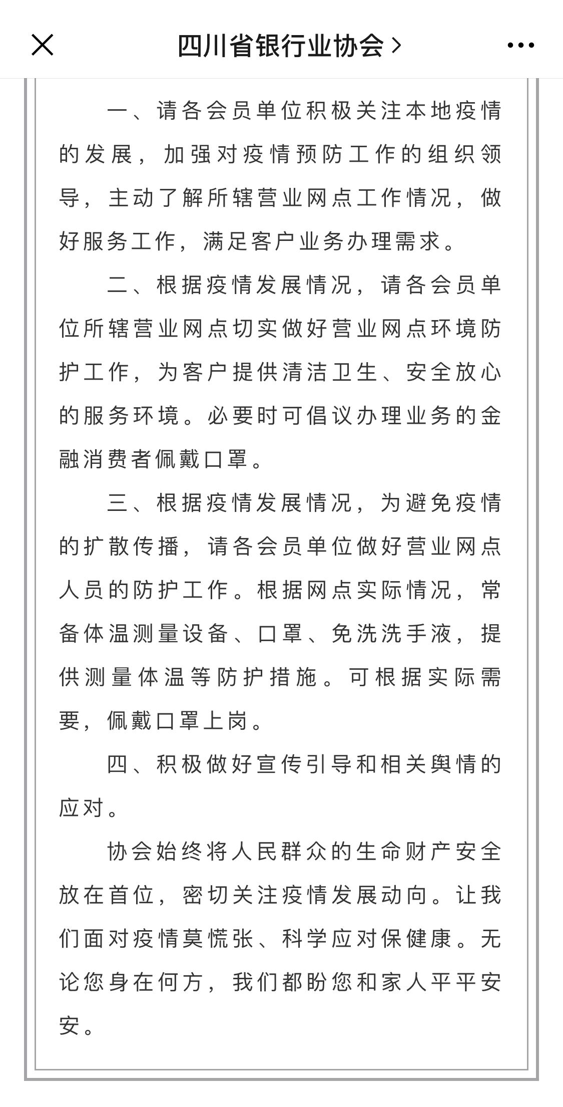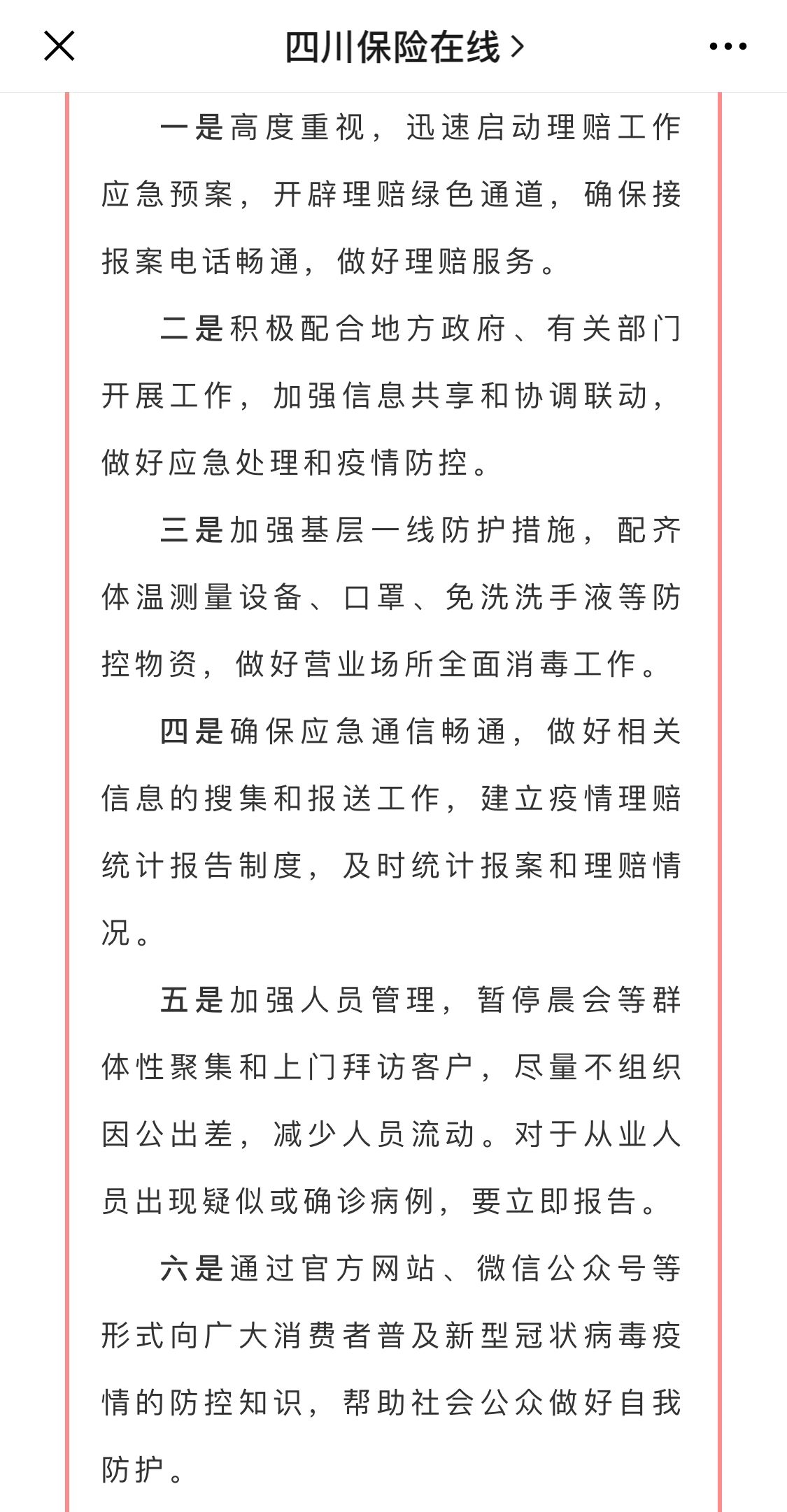 为做好疫情防控,按照四川省政府”突发公共卫生事件I级应急响应“的要求,四川银保监局坚决落实银保监会和省委省政府相关安排部署。在四川银保监局指导下,四川省银行业协会和四川保险行业协会已相继发出倡议,号召全省银行保险机构高度重视,积极配合地方政府、相关部门展开防疫工作,确保应急通信畅通,做好信息搜集和报送,加强营业场所和人员管理与防护,满足客户安全办理业务需求,开辟理赔绿色通道,积极开展消费者防疫知识宣导,帮助社会公众做好防护等。