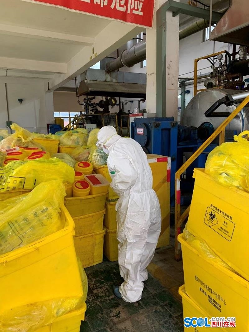 记者了解到,两个指导组分别由省生态环境监测总站副站长史箴和省生态环境科学研究院固废所所长雍毅带队。在绵阳市,指导组现场检查了绵阳中科绵投危险废物治理有限公司。目前,该公司负责收集处置全市确诊和疑似病例收治医院的医疗废物,入场后优先处置,不暂存。绵投公司设计处置能力5吨/天,春节期间实际处理量不超过1吨/天,采用高温蒸煮+破碎处置后,送生活垃圾焚烧厂。