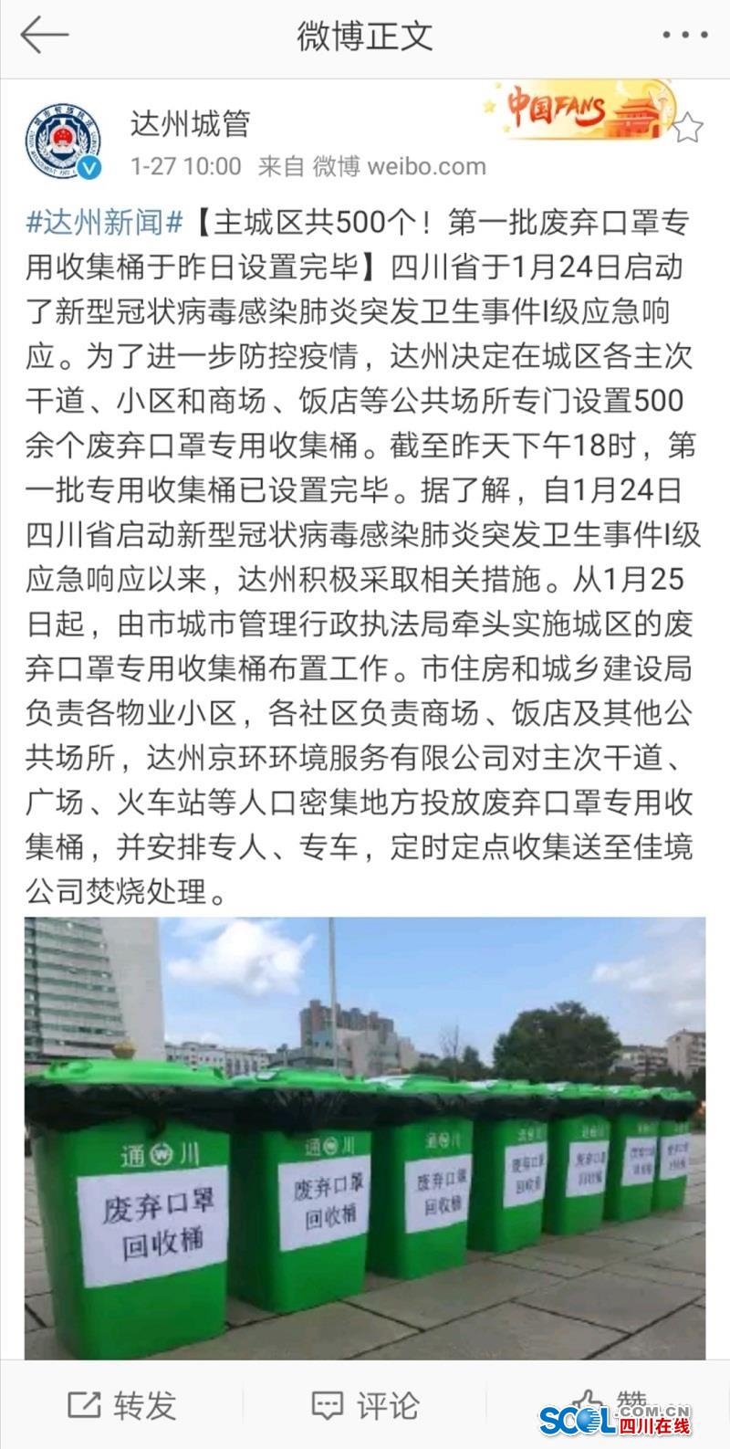 四川省于1月24日启动了新型冠状病毒感染肺炎突发卫生事件Ⅰ级应急响应。为了进一步防控疫情,达州决定在城区各主次干道、小区和商场、饭店等公共场所专门设置500余个废弃口罩专用收集桶。截至昨日(26日)下午18时,第一批专用收集桶已设置完毕。