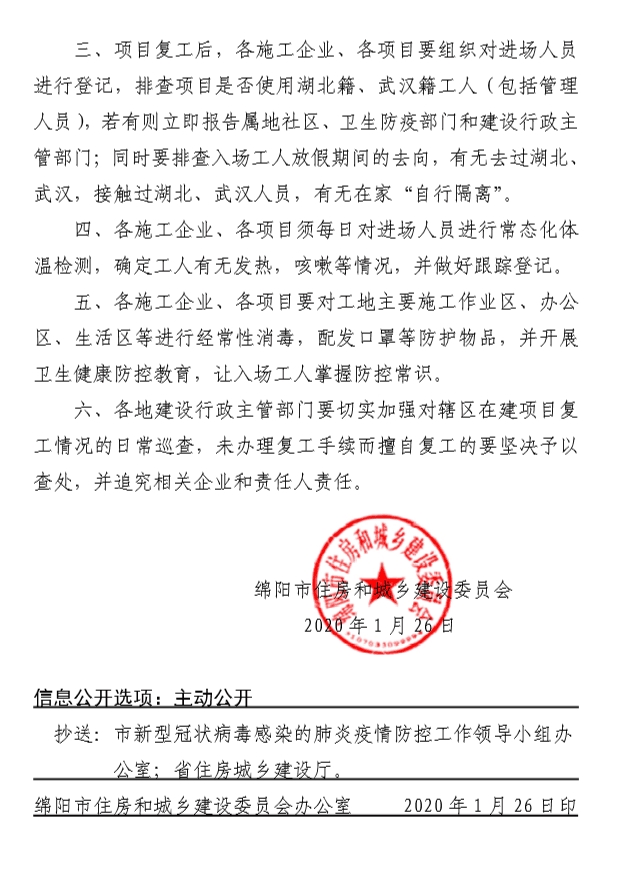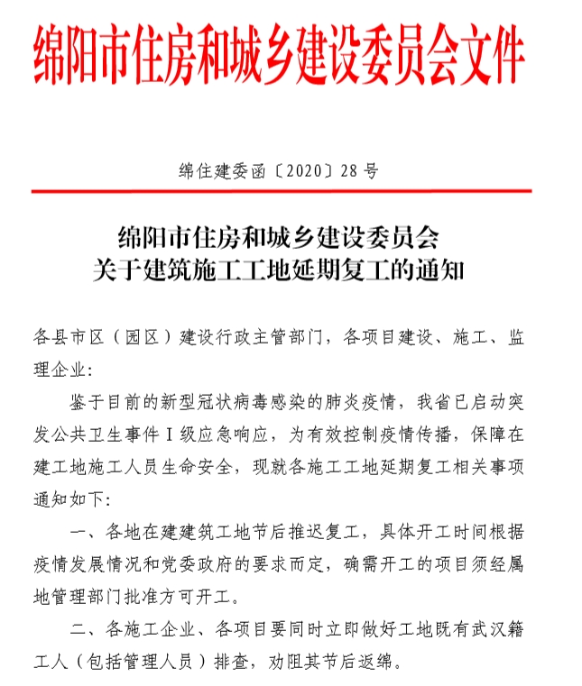 四川在线消息(陈冠宇 记者 祖明远)1月27日,记者从绵阳市住房和城乡建设委员会获悉,为有效控制疫情传播,保障在建工地施工人员生命安全,已发出《关于建筑施工工地延期复工的通知》。通知要求,全市各地在建建筑工地节后推迟复工,具体开工时间根据疫情发展情况和党委政府的要求而定,确需开工的项目须经属地管理部门批准方可开工。