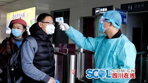 四川在线消息(罗冬梅 记者 陈碧红)1月27日,正月初三晚上9点30分,青白江高铁站依旧灯火通明。大弯社区卫生服务中心、大弯街道、区交通局的工作人员正在为到区的乘客进行发热预检。