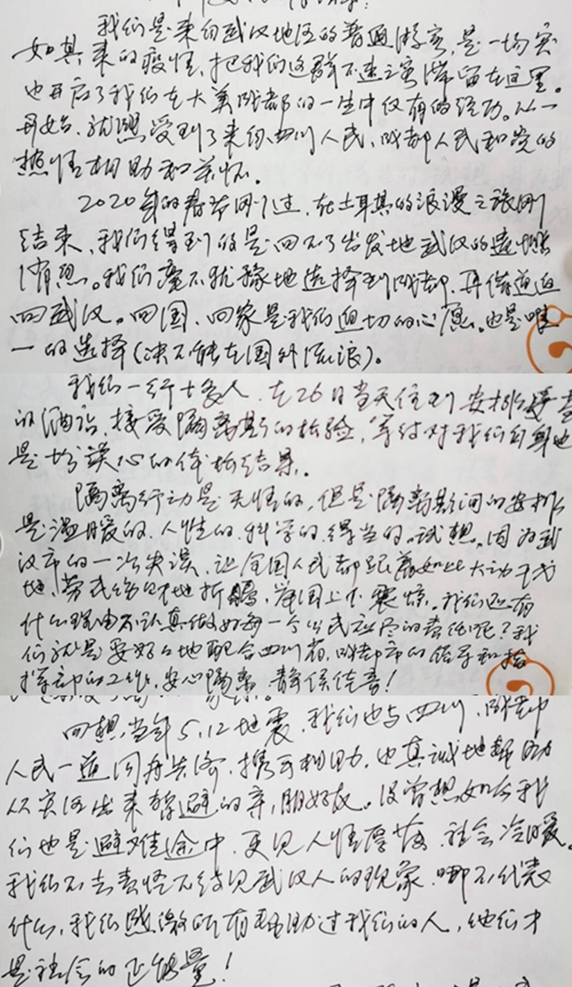 这是1月27日,一名滞留成都的武汉旅客刘大伟(化名)向四川人民发来的感谢信。