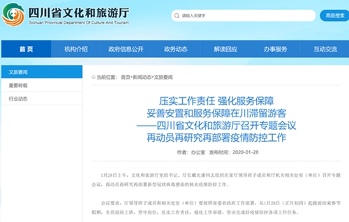 1月23日,成立四川省文化和旅游厅应对新型冠状病毒感染的肺炎疫情联防联控机制领导小组;同一天,面向游客和群众的各类文化活动全部取消或延期。