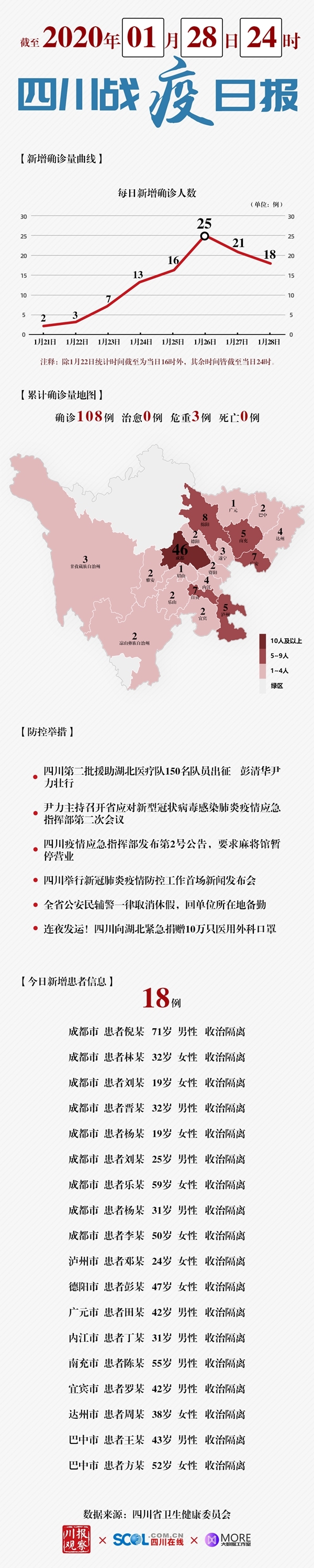 截至1月28日24时,我省累计报告新型冠状病毒感染的肺炎确诊病例108例,涉及19个市(州)。其中成都市46例、绵阳市8例、自贡市7例、广安市7例、泸州市5例、南充市5例、内江市4例、达州市4例、遂宁市3例、甘孜州3例、德阳市2例、乐山市2例、宜宾市2例、巴中市2例、雅安市2例、资阳市2例、凉山州2例、广元市1例、眉山市1例。