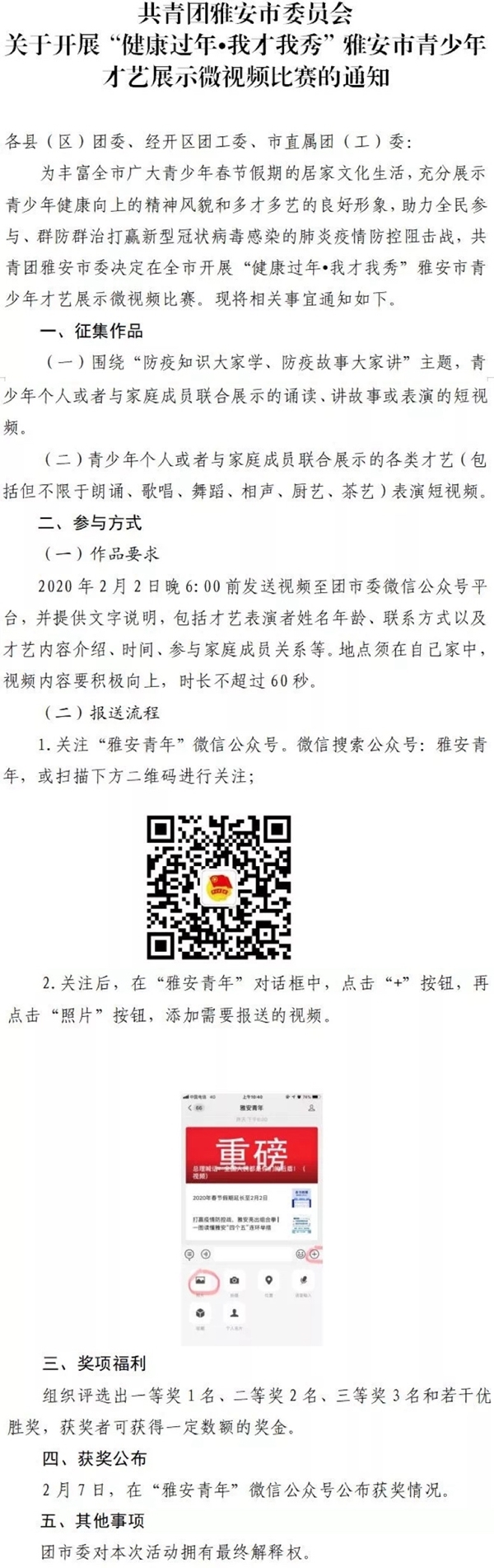 比赛结果将于2月7日在微信公众号平台“雅安青年”公布,获奖者还可获得一定数额奖金。