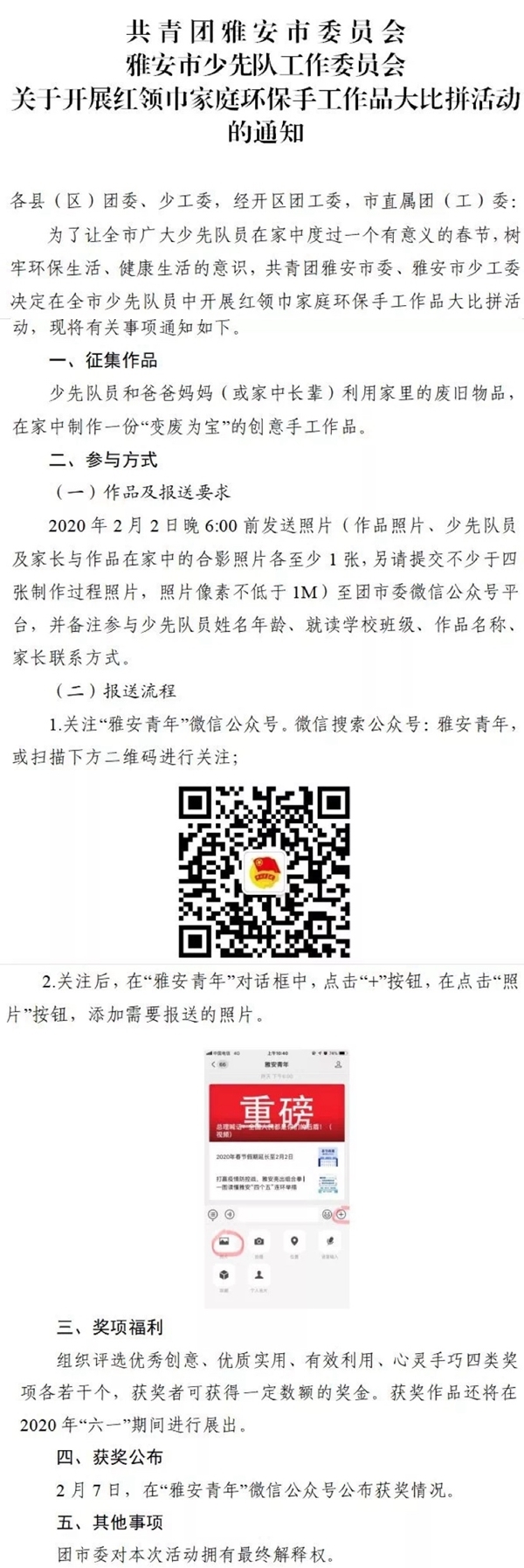 而家庭环保手工作品大比拼活动则是鼓励少先队员和爸爸妈妈(或家中长辈)利用家里的废旧物品在家中制作一份“变废为宝”的创意手工作品,于2020年2月2日晚6:00前发送作品照片至团市委微信公众号平台“雅安青年”,并备注参与少先队员姓名年龄、就读学校班级、作品名称、家长联系方式,即可参赛。