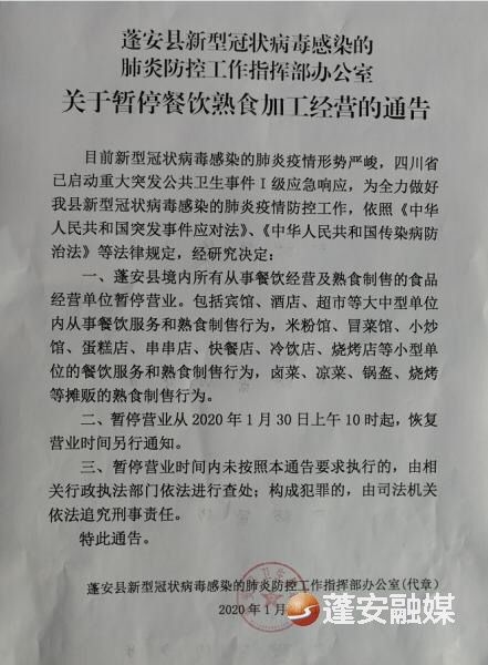 一、蓬安县境内所有从事餐饮经营及熟食制售的食品经营单位暂停营业。包括宾馆、酒店、超市等大中型单位内从事餐饮服务和熟食制售行为,米粉馆、冒菜馆、小炒馆、蛋糕店、串串店、快餐店、冷饮店、烧烤店等小型单位的餐饮服务和熟食制售行为,卤菜、凉菜、锅盔、烧烤等摊贩的熟食制售行为。