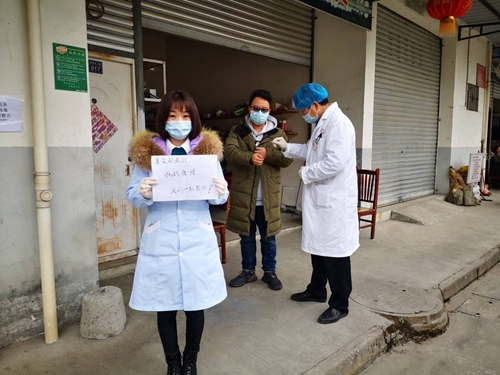 通过微信,朱元旭把这张照片发送给了妻子。不一会儿,他收到了妻子的回复,同样是一张照片,在一户村民的家门口,妻子举起一张写着“亲爱的老公,抗战疫情,我们一起努力!”的A4纸。