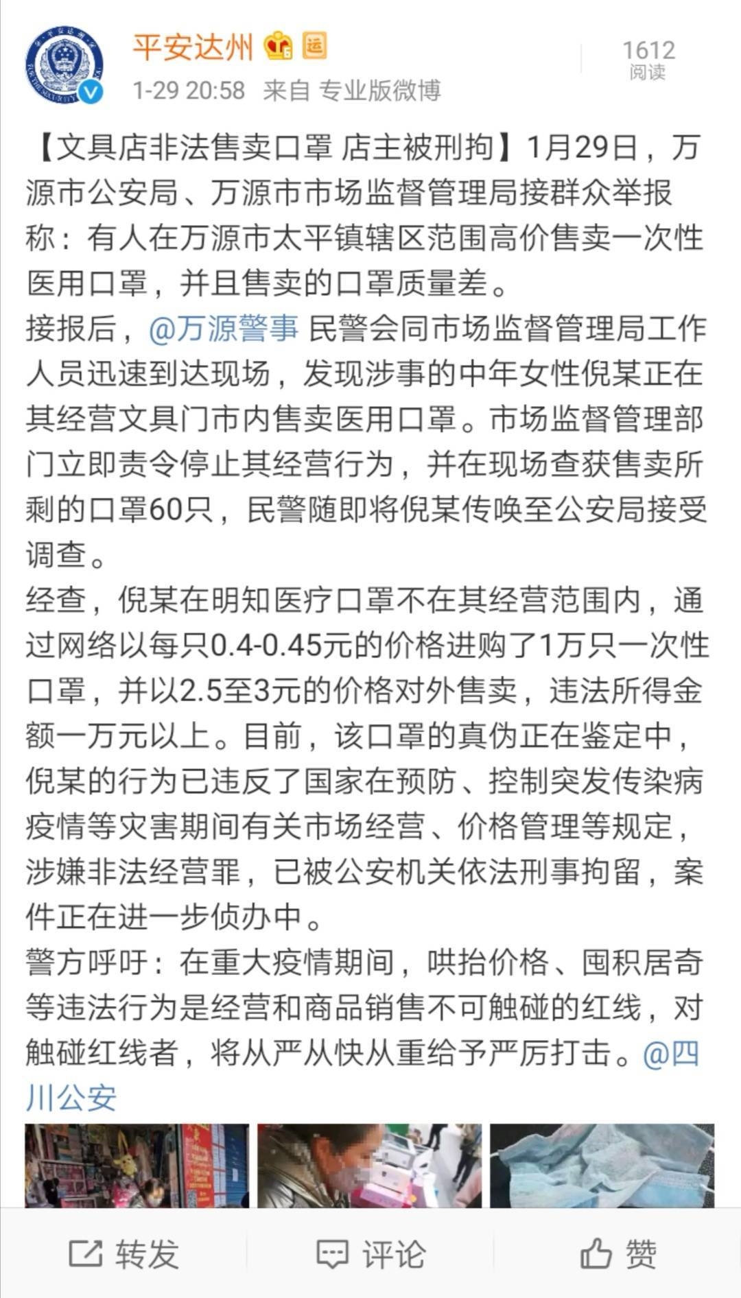 四川在线消息(记者 袁城霖)1月29日晚,达州市公安局微博平台发布公告:万源市一文具店非法售卖口罩,店主已被刑拘。