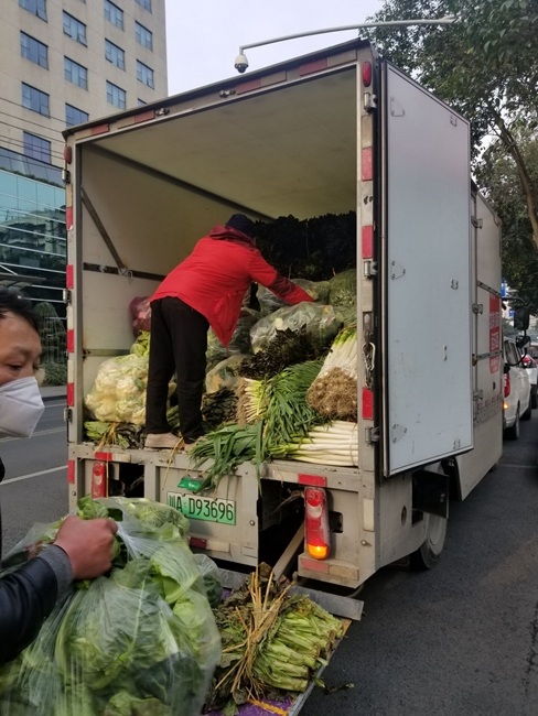 1月30日上午,3车蔬菜运抵成都市武侯区簧门街社区,听说消息和路过的居民纷纷上前选购。