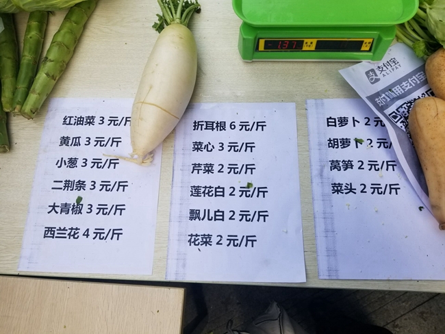 红油菜一斤3元、黄瓜一斤3元、大青椒一斤3元……16种蔬菜,除了折耳根是一斤6元,多数蔬菜价格都在2至4元一斤。“平常亲民的价格啊”,居民肖利民感慨着,选购了一个水嫩的大萝卜。