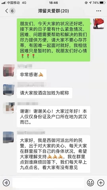 1月29日,青羊区西御河街道辖区酒店和民宿入住了20余名湖北籍来蓉的滞留游客,派出所民警牵头建立了“滞留关爱群”的微信群,将仍他们纳入关爱群。