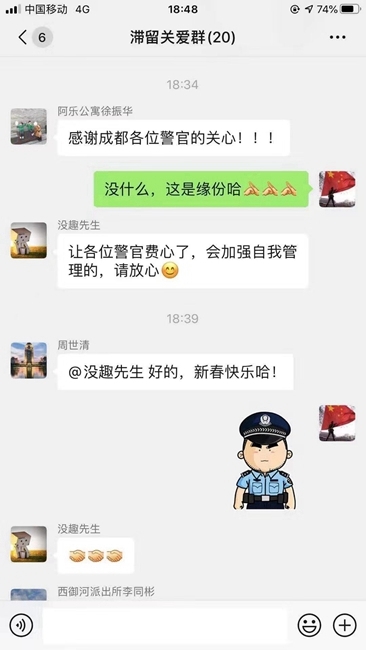 同时,派出所相关负责人、社区民警、社区书记、卫生防疫工作人员和酒店民宿经营人员也加入群内,各司其责开展每日回访、疫情咨询、防护指导、上门服务、嘘寒问暖、生活物资保障等工作,让他们感受成都这座城市的温暖。