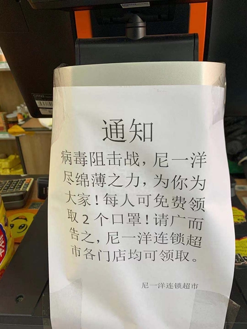 超市的柜台显眼处粘贴着一张通知,上面写着“病毒阻击战,尼一洋尽绵薄之力,为你为大家。每人可免费领取2个口罩”等字样的内容。德波说,这几天,前来领口罩的,有老人也有小孩,“在每天下午2点左右,500个口罩就发完了。”