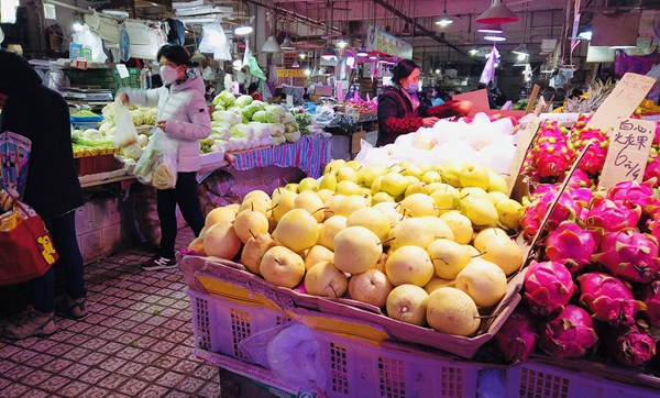 白心火龙果6元/斤、大白菜1.5元/斤……不少摊贩直接将价格标注出来。“基本没涨价,有些菜还便宜了一些,每天早上六点过卖到晚上六点过,整个市场的状况和以往过年没啥区别。”商贩蔡宇说。