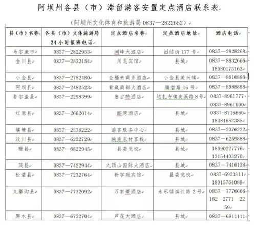 据了解,在新型冠状病毒感染的肺炎疫情I级应急响应期间,滞留在州的游客,可及时联系各县(市)文化体育和旅游行政部门,以及13家定点酒店,他们将竭诚为游客提供妥善照顾和服务。阿坝州各县(市)文化体育和旅游行政部门,以及接待外地游客定点酒店联系电话公布如下: