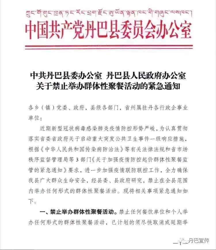 面对严峻复杂的疫情形势,丹巴全县党员干部把疫情就是命令,防控就是责任当做初心,自1月26日下发《关于禁止举办群体性聚餐活动的紧急通知》以来,全县各乡镇、各部门迅速行动,大力宣传,得到群众普遍的理解支持和积极配合。