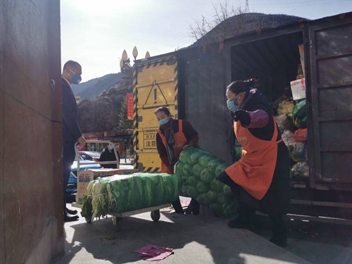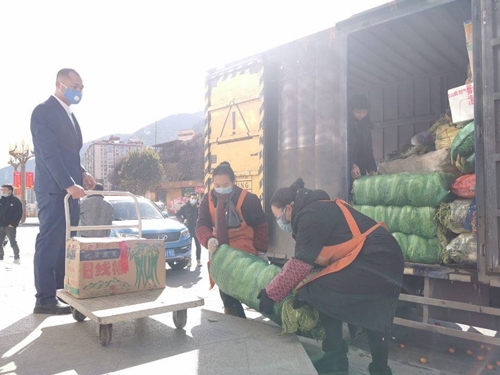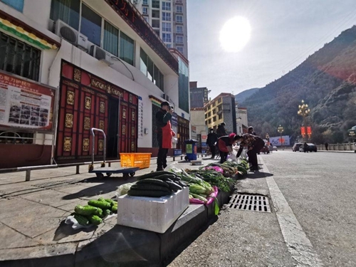 四川在线消息(记者 徐中成)1月30日中午,阿坝州马尔康市大润发超市旁,明晃晃的太阳下,浙江人黄峰和两个工作人员戴着口罩,正在用板车把一辆货车上的蔬菜、水果一袋袋搬进超市。