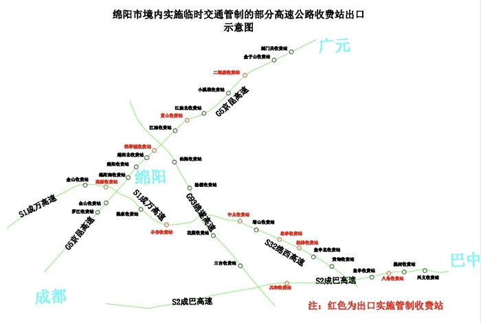 四川在线消息(记者 付真卿)今日(1月31日)上午8点,记者从四川高速公安二分局获悉绵阳市周边高速公路紧急路况信息,为确保广大人民群众身体健康和生命安全,结合当前绵阳市新型冠状病毒感染的肺炎疫情面临的复杂形势,集中力量全力做好疫情防控工作,依据《中华人民共和国传染病防治法》《中华人民共和国突发事件应对法》的有关规定,高速交警决定对绵阳市境内部分高速公路出口实施临时交通管制,现将有关事项通告如下: