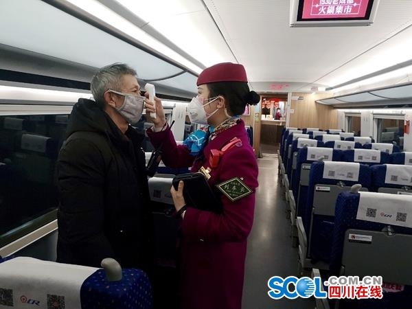 四川在线消息(胡志强 记者 李向雨 摄影报道)1月30日,在广州南至成都东的D1810次动车组上,列车长周弋乔认真巡视着车厢,观察着每一名旅客,开展测温工作。由于是新型冠状病毒肺炎防控的特殊时期,她不但要按照乘务正常作业标准开展车内巡视巡查,还要仔细观察、了解和询问有无发热、咳嗽、呼吸困难的旅客需要重点帮助。