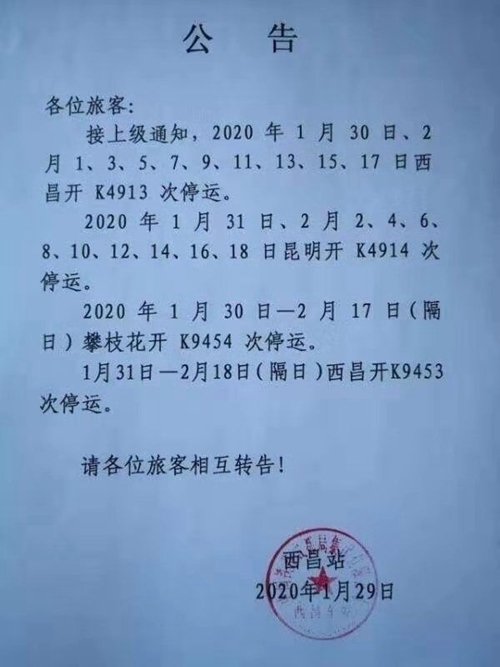 四川在线消息(记者 何勤华)受新型冠状病毒感染的肺炎疫情影响,西昌火车站部分列车停运,分别为: