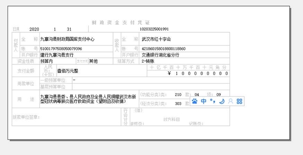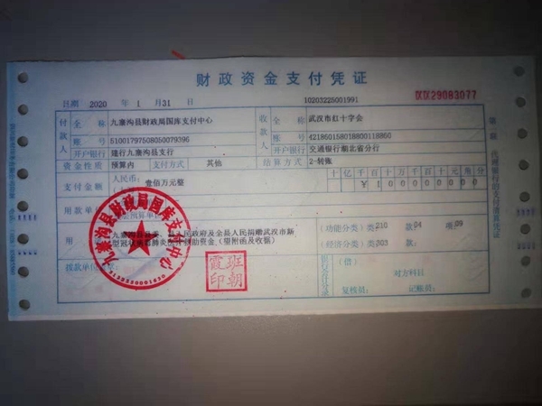 四川在线消息(王吉玲 记者 徐中成)1月31日,经九寨沟县委、县政府研究决定,该县财政向湖北省武汉市红十字会捐赠100万元人民币,用于疫情防控。