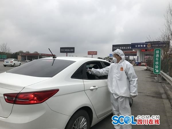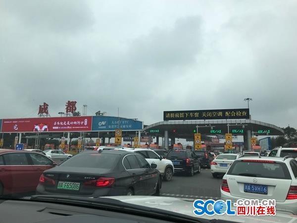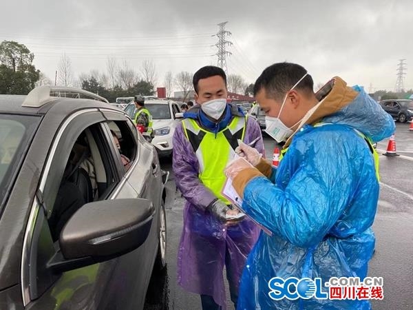 在成南高速入口,即可看到“前方检疫检查,请提前摇下车窗,配合检测体温”等提醒标志。所有工作人员都穿戴好防护服、口罩等防护措施,对每一辆进入成都的车辆进行检测。