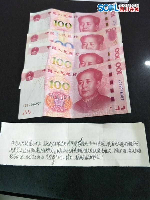 “作为21世纪的小学生,虽然我不能为此次疫情的控制做什么贡献。钱虽然不能买到生命,但我希望这些钱可以帮助到更多人。我真诚地希望祖国可以渡过难关,中国加油!武汉加油!党员加油!医护人员加油!志愿者加油!十年后,换我们保护你们!”