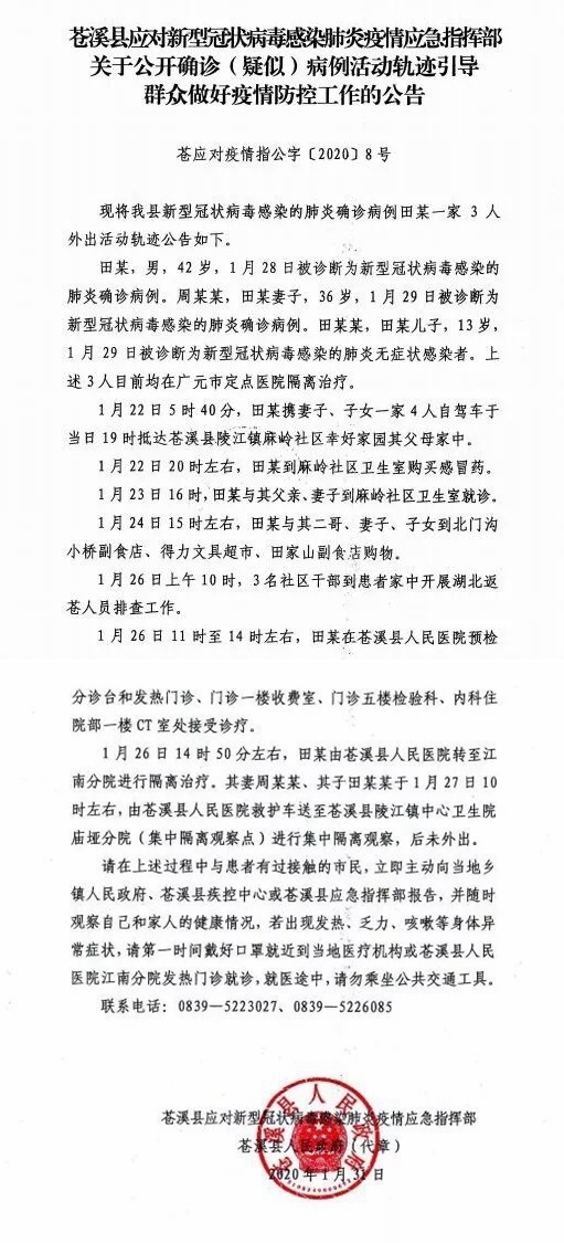 1月31日,苍溪县应对新型冠状病毒感染肺炎疫情应急指挥部公布确诊病例田某一家3人外出活动轨迹如下: