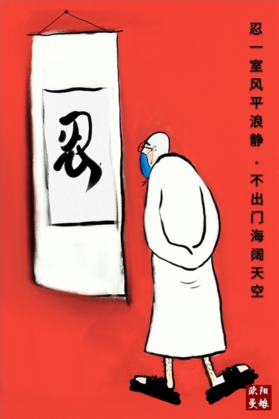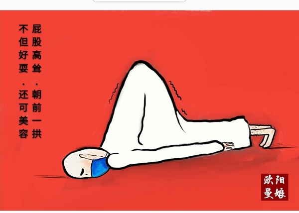 四川在线消息(记者 边钰)喜庆大红色上,戴着口罩的白袍光头老师傅正对着镜中的自己独酌,左边配着“今天狠心躲着你,明天才能在一起”的诙谐话语;另一张漫画中,同样的光头师傅身体弯成弓形,瑟瑟发抖做着瑜伽,“屁股高耸朝前一拱不但好耍还可美容”的土味打油诗配着憨态的人物形象,让人忍俊不禁……
