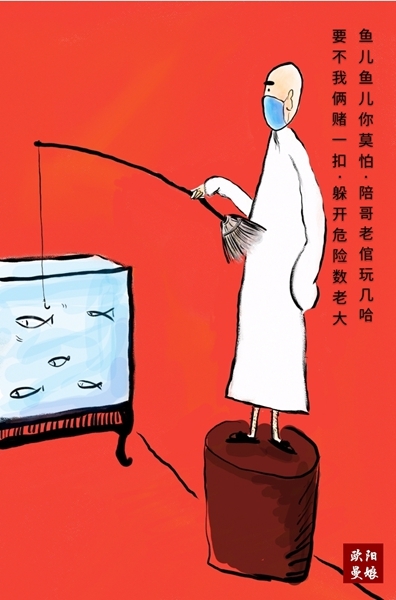 每年春节,欧阳曼娘都有绘制画作向身边朋友拜年贺春的习惯。今年,宅在家中的她在微信中看见一张市民在自家鱼缸垂钓的图,被图击中笑点。她特意选用一位儒雅的师傅形象,用自己擅长的漫画表现图中内容。光头白袍长胡的正面形象配上脑洞大开的场景,一种漫画的反差萌感漫卷画面。